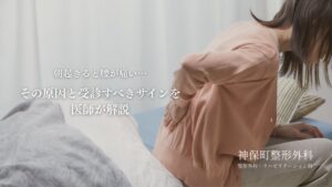 朝起きたときの腰痛は、筋肉の緊張、寝返りの少なさ、ストレス、冷え、椎間板の問題など、さまざまな原因が考えられます。 多くの場合、寝具の調整や生活習慣の改善で症状が軽減しますが、2週間以上痛みが続く場合や、足のしびれ・排尿障害などの症状がある場合は、早めに整形外科を受診することが大切です。 首・肩・腰の痛みは、その人の生活そのものを変えてしまうことがあります。症状を年齢のせいとあきらめず、どうかご相談ください。神保町整形外科は、痛みを少しでも軽くし、また動ける日常を取り戻すことを全力でサポートいたします。 朝の腰痛でお悩みの方は、ぜひ一度神保町整形外科にご相談ください。あなたの痛みの原因をしっかり調べ、最適な治療をご提案いたします。